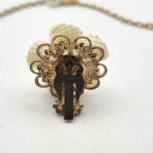 This exquisite necklace and earring set by Trader Hall's embodies the charm of Hawaiian craftsmanship. Designed with intricate shell flowers and delicate detailing, this set offers a timeless style that complements various outfits. The clip-on earrings ensure comfortable wear, making it an elegant addition to any jewelry collection.