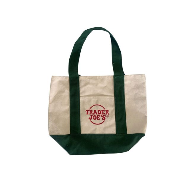 • Brand New Trader Joe’s Mini Canvas Tote Bag - Green & Cream, perfect for eco-conscious shoppers and style enthusiasts.