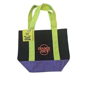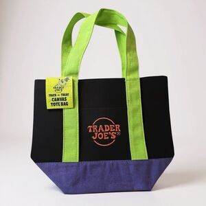 Brand New Trader Joe’s Trick or Treat Tote - Striking Multicolor black body with lime green straps and purple base.