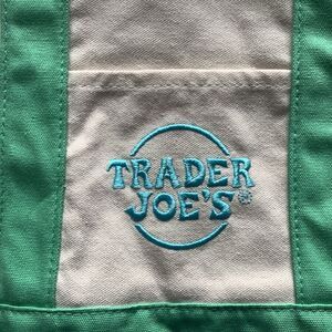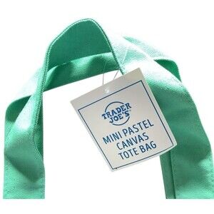 Cute Trader Joes mini tote. Natural canvas, mint green bottom, light blue logo.