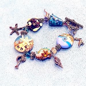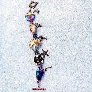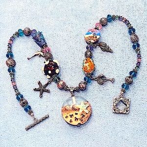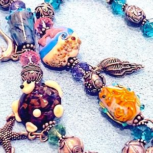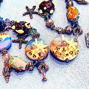 Sterling beach charms dangle below Rick's gorgeous glass beads, Balinese sterling and Swarovski crystals.