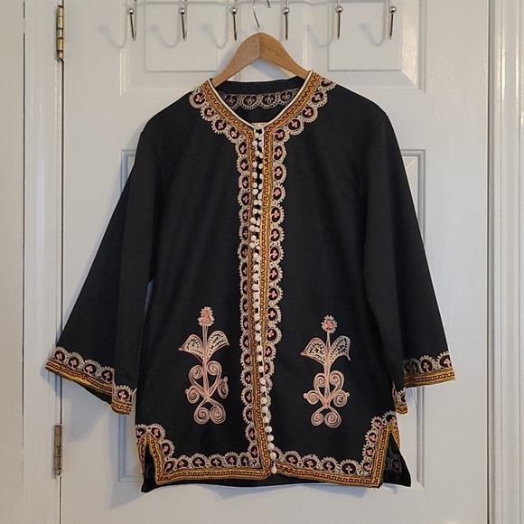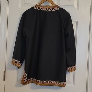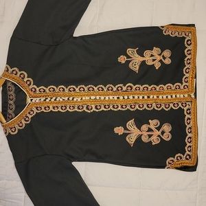 Black traditional dress/shirt with hand embroidered decorative pattern.