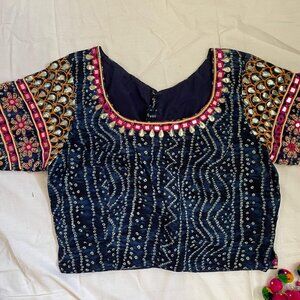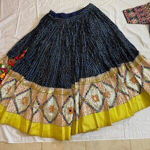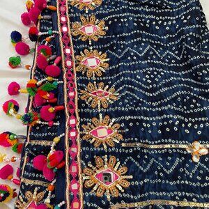 This is beautiful a custom-made traditional, Rajasthani lehenga. It's quite heavy and the skirt has a beautiful twirl. It's a bandhani print with gamthi, mirror and thread work.