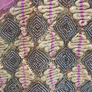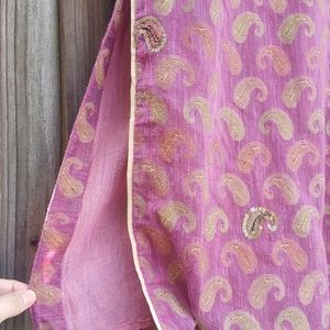 Beautiful vintage cap sleeved kurta from K C clothing brand in good used condition. Small flaw in the beading in right armpit. Lightweight linen type material - pink with gold stitching and ornate beading work makes it special while still keeping it casual. Tag has no size but is an XS-S. 37" long from shoulder to hem, bottom side slits on both sides go up 15" from bottom hem. Chest measures 18" across laying flat and widest part on dress is 19" across laying flat.