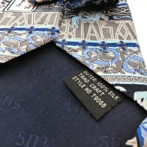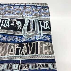 Silk tie inspired by the Book of Kells. The design features elaborate designs and lettering from the Book of Kells in hues of blues, silvers, and grays.