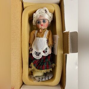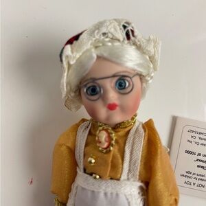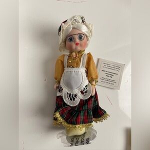 Charming traditional doll featuring a vibrant yellow top and a red plaid skirt. Perfect for collectors and as a decorative piece. Includes certificate of Authenticity, and bracelet