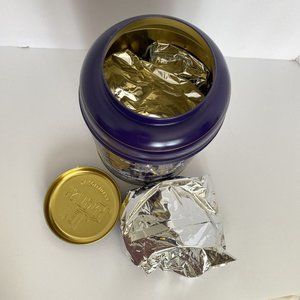 The tin measures approximately 9 3/4 inches tall x 6 1/2 inches diameter.