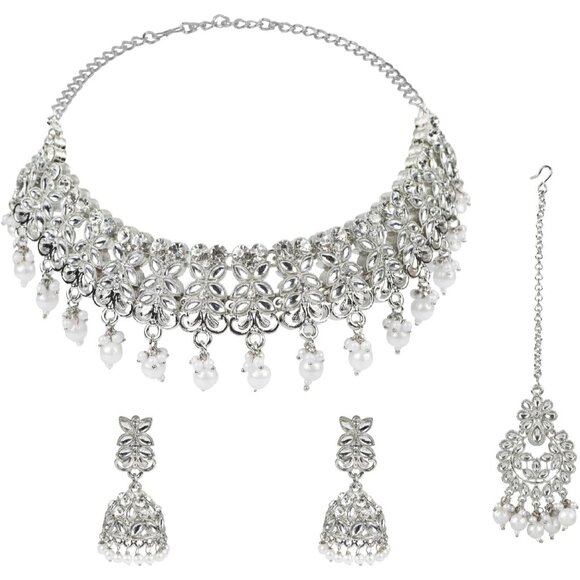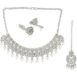 Features: This beautiful jewelry set includes a choker, earrings, and a maang tikka. Crafted from alloy with copper base, embellished with kundan and faux pearls for a timeless yet contemporary vibe. The set has a sleek, elegant silhouette perfect for traditional occasions or festive celebrations.