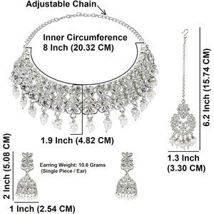 Measurements: Choker: 6.6 inches with adjustable chain; Earrings: 2 inches x 1 inch; Maangtikka: 6.2 inches x 1.3 inches