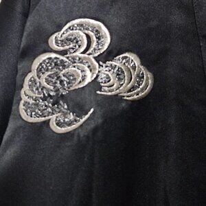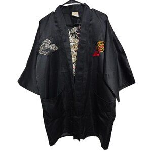 This black satin kimono robe features intricate embroidery of a vibrant dragon and clouds, providing a striking traditional aesthetic with a luxurious feel.