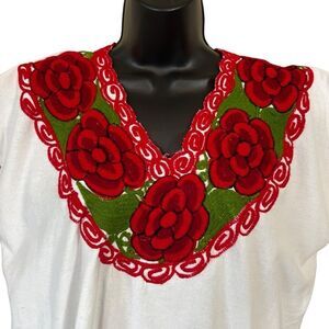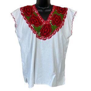 This Red Embroidered Mexican Top is an authentic Mexican Blouse full of colorful red embroidered details. It has a beautiful V neck design surrounded by flowers in beautiful red Colors.