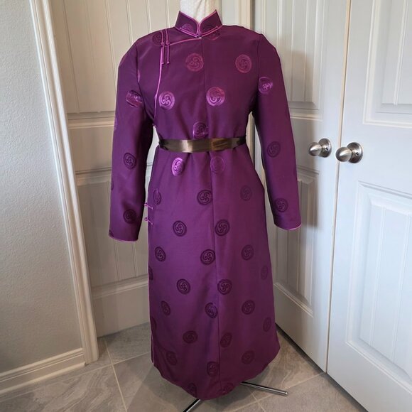 Traditional Costume Mongolian Robe Style Stand Collar Ethnic Clothing Asia. Made with Silk and Polyester blend. I personally purchased this dress in Ulaanbaatar, Mongolia summer 2025. Notice the beautiful knots they use as fasteners (buttons) on the dress. You can use any scarf, ribbon, fabric to tie this dress at the waist. I just added this brown ribbon. In the picture you'll notice this is a single layer of fabric; it doesn't get hot. I only wore this once. It is beautiful. Mannequin is a size 10 and there is plenty of room to scrunch up the fabric for shaping at the waist. Mannequin's shoulders are 53 inches from the ground.