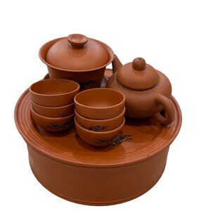 Traditional Terracotta Tea Set With Teapot 6 Cups Lid & Tray Hand-Painted Dragon