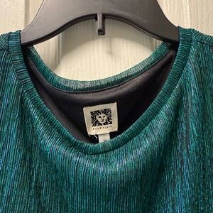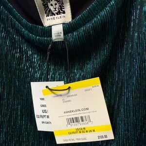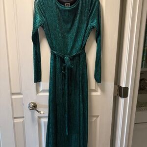Luscious metallic green mid length cocktail/wedding dress. It’s 35” from waist to floor. Lovely jewel neckline. Drapes beautifully. Never worn.
