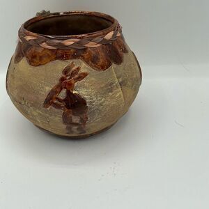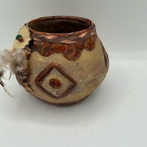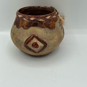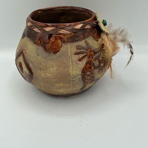Unique handcrafted pot with feather accents. Features earthy tones and artistic details.