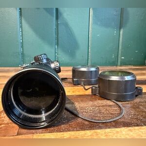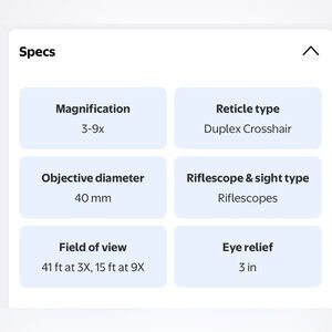 3-9 adjustable x 40. Scope, caps, and rings only, no weaver rail. Like new, only used 2 times. No scratches on lenses. Scope cap cord seems loose fitting out of the box, if I kept it personally would shorten or put a more elastic cord on them. Also I do not have the original packaging, see actual pictures.