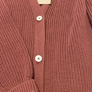 Soft ribbed knit cardigan. Deep V-neck with two front buttons. Relaxed fit with dropped shoulders. Long sleeves with fitted cuffs. Versatile, easy-to-layer piece.