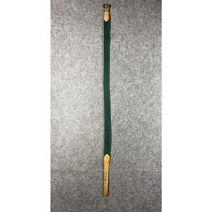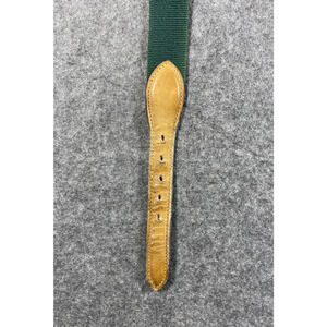 Color: Green strap with tan/brown leather trim; brass-tone buckle