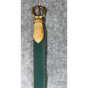 Item: Mens surcingle belt with green canvas/web strap, leather tabs, and brass buckle