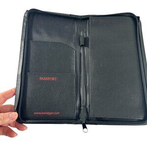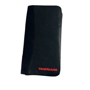 Trafalgar Black Passport Travel Case Black Faux Leather Card Wallet Zip Around in preowned condition with light signs of wear. Measures 10" X 5" X .25".