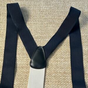 Trafalgar suspenders/braces in navy elastic with black leather button-on ends and tan leather cross patch. Features gold-tone adjustable hardware stamped “Made in Germany,” a mark of quality. Clean, lightly used condition with minimal signs of wear.