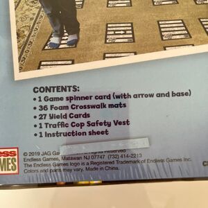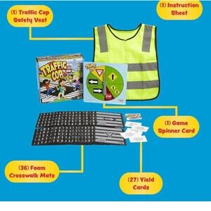 DETAILS: This game includes a Traffic Cop vest, 36 Crosswalk mats, and 27 Yield cards. The Traffic Cop spins the spinner for each player to move along the crosswalk mats, one at a time. Watch out for traffic jams!