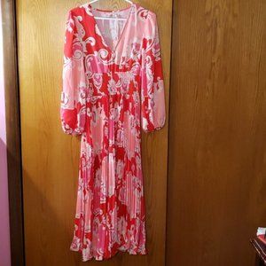 *Features a V neck; slightly puffed shoulder; long sleeves with elastic at wrists, a thick, ruched waist (very food baby/lockdown weight gain friendly!) & a pleated midi skirt, all in a gorgeous print of coral, cream, carnation pink & white.