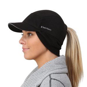 Warm hat with brim, stretchy fleece with ear flaps, neck cover and brim for bright sun. Great hat for running, walking, dogwalking, hiking.