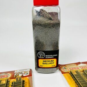 model train set, realistic ballast, train track bundle, medium gray ballast, Woodland Scenics, T&S train tracks, track accessory pack, hobby train layout, train ballast kit, railroad track set, model layout tools, straight train tracks, detailed model scenery
