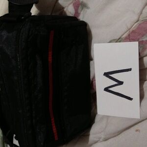 Black train case. Top has double zipper opener with Velcro sealer. Strap is adjustable from 42 inches to 25 inches long. Interior is lined in red with 2 compartments. Exterior compartment has a zipper closure. All sides are cushioned. Measures 9 inches by 5 inches by 5 1/2 inches. Material appears to be polyester. No tags. Never used.