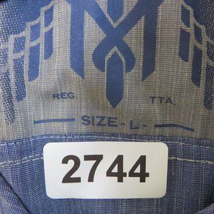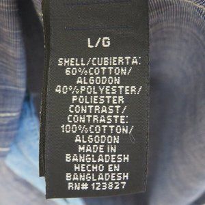 Pre-Owned Condition! 60% Cotton/40% Polyester. Handsome Blue & White Brushed Style Color with White Stitching Button Down Double Chest Pocket Shirt with Blue Glossy Buttons(Red Thread)Spare buttons attached. Two Red stains on Shoulder.