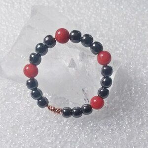 Tranquility! Red Coral & Gray Hematite Beads! S7 Beaded Gemstone Midi Stack Ring