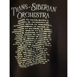 The Trans Siberian Orchestra 2019 Winter Tour 2-Sided Black XL T-Shirt is a high-quality, comfortable piece of men's clothing featuring a crew neck, short sleeves, and a double-sided graphic print with the Trans Siberian Orchestra logo. Made of breathable cotton knit fabric, this shirt is easy to care for and machine washable. The regular fit and XL size make it a great choice for any fan of the band, perfect for wearing in any season.