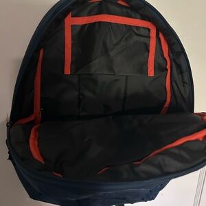 Stylish navy blue backpack featuring bold red and light blue accents. Perfect for everyday use with a unique design.
