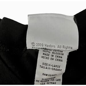 Officially licensed 2009 Hasbro Transformers “Protect” t-shirt featuring Optimus Prime in bold red, white, and black print. This black short sleeve tee is made of 100% cotton and tagged size X-Large. Originally categorized as sleepwear, it works perfectly as a casual graphic tee. The shirt has a visible flaw—some seam separation under the arm (see photo)—but still wears well overall.