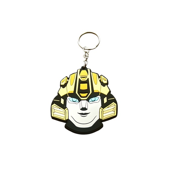 Fun robot keychain with yellow and black design. Perfect for fans and collectors.