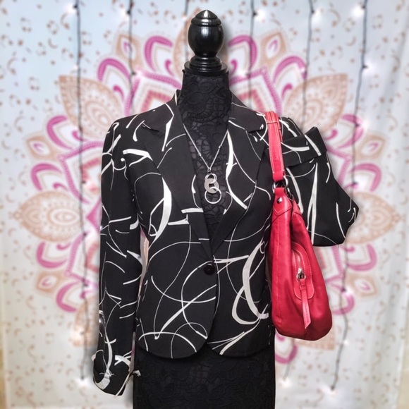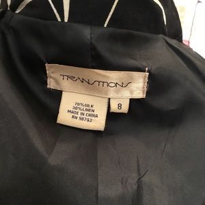Transitions Pattern Blazer Single Button Jacket with front pockets and rounded hemline. Jazz up all of your holiday outfits with this stunning blazer! Fully Lined inside. Sleeves have a slit for easy roll up cuffs. Some padding in the shoulders for a more defined look.