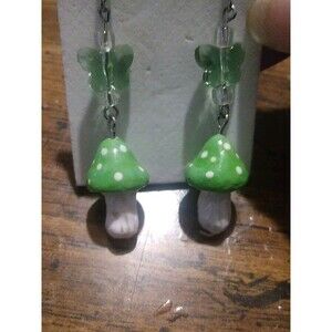 Translucent Green Butterfly And Mushroom Earrings Dangle/drop Whimsical Fairy...