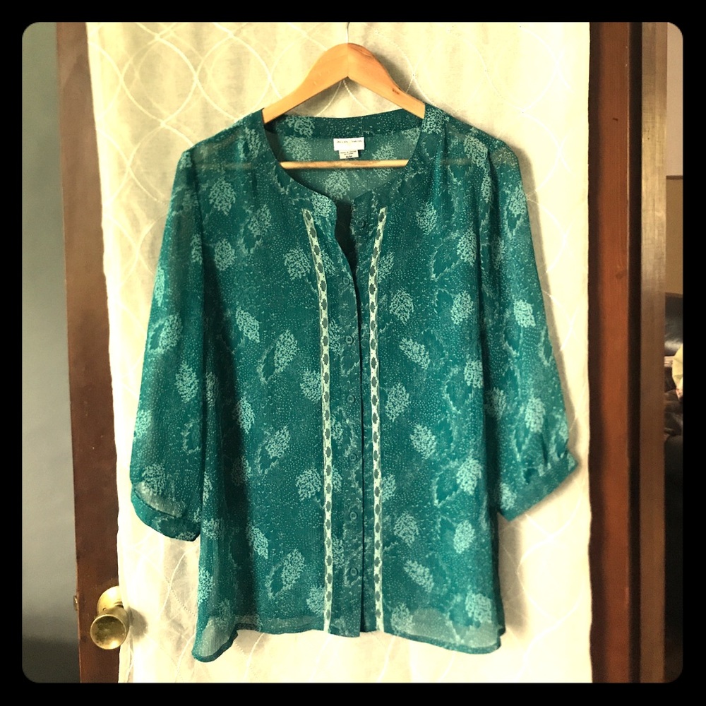 Dark teal flowing translucent blouse with lace detail. Button down. Machine wash and dry.