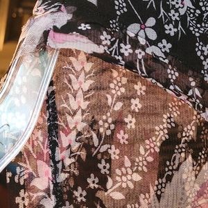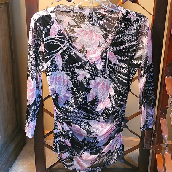3/4 sleeve. translucent top with a black layer built in underneath. ruffled fabric at the waist