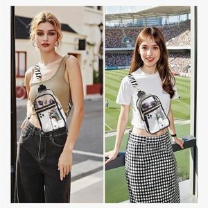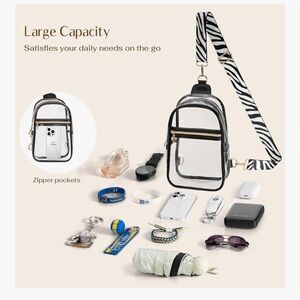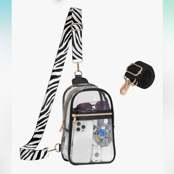 Stylish transparent mini backpack with black trim. Perfect for carrying essentials with ease. Features a chic zebra-patterned strap for added flair.