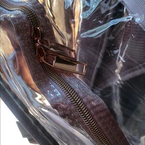 Stylish and functional transparent pink backpack, perfect for everyday use. Features a spacious main compartment and a front zip pocket for easy access to essentials.