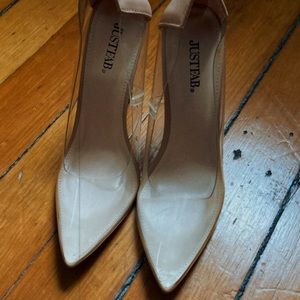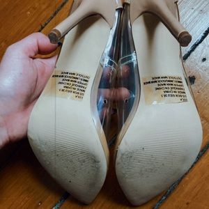 Transparent pumps with tan heel. Worn once. I’m a size 8 but these were a bit tight. They feel more like a 7.5, which is why I’m parting with them.