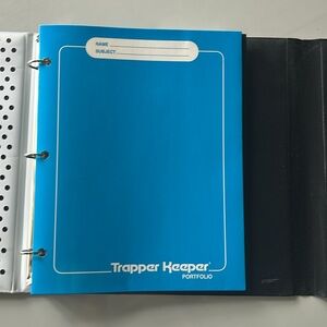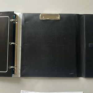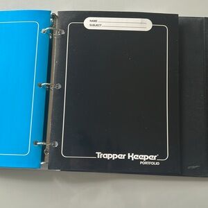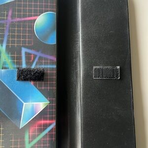Preowned Geometric Design Retro Looking Trapper Keeper 2" 3- Ring Binder with 2 pocket folders and clip board back. Excellent used condition EXCEPT for the plastic on the side (see last pick).