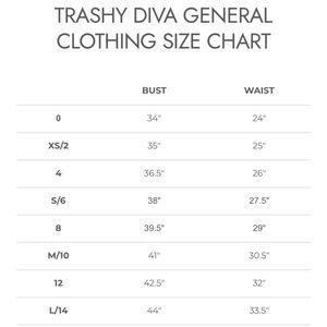 Trashy Diva “Jenny” dress in a soft, stretchy black rayon knit, size 6. This dress is perfect for a 1940s pinup girl take on the classic little black dress! The fabric is very soft and stretchy. Please see size chart in pictures.