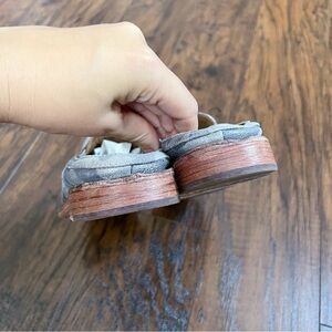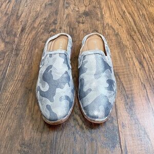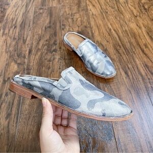Fabulous slip on mules / slides by Trask (sold at Anthropologie). “Ashley” style in "Pewter Camo" (metallic silver & grey camouflage print leather). Size 7.5, excellent preowned condition.