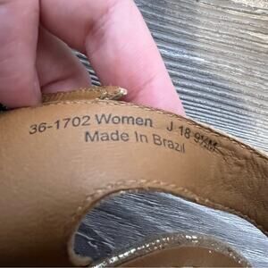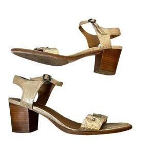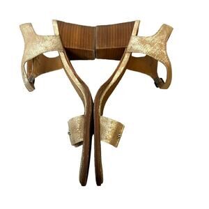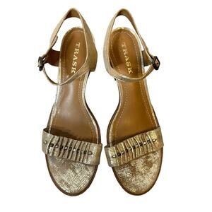 Trask Carrie Ruffled Beaded Metallic Gold Block Heel Sandals sz 9.5