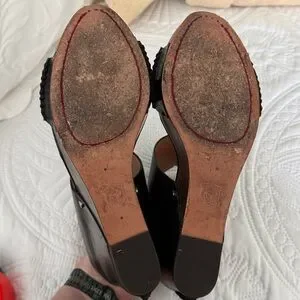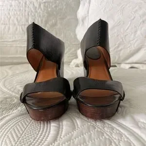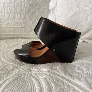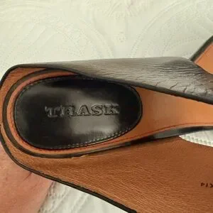 Trask Riki black leather wedge sandal. Such a cute shoe! The heel is easier to wear with the platform in the front. Can be worn casual or dressy.