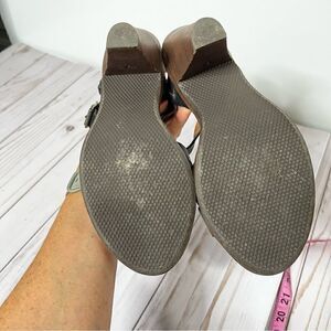 Thin insole layer starting to peel up and few scuffs on wooden heel as pictured, otherwise great condition