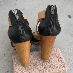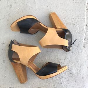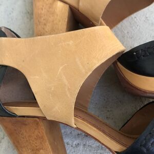 Super cute and in good condition but not perfect so please look at the pictures. The marks on the tan strap that I show wood polish out. Heels are good and measure 4.5 inches platform is a quarter inch.